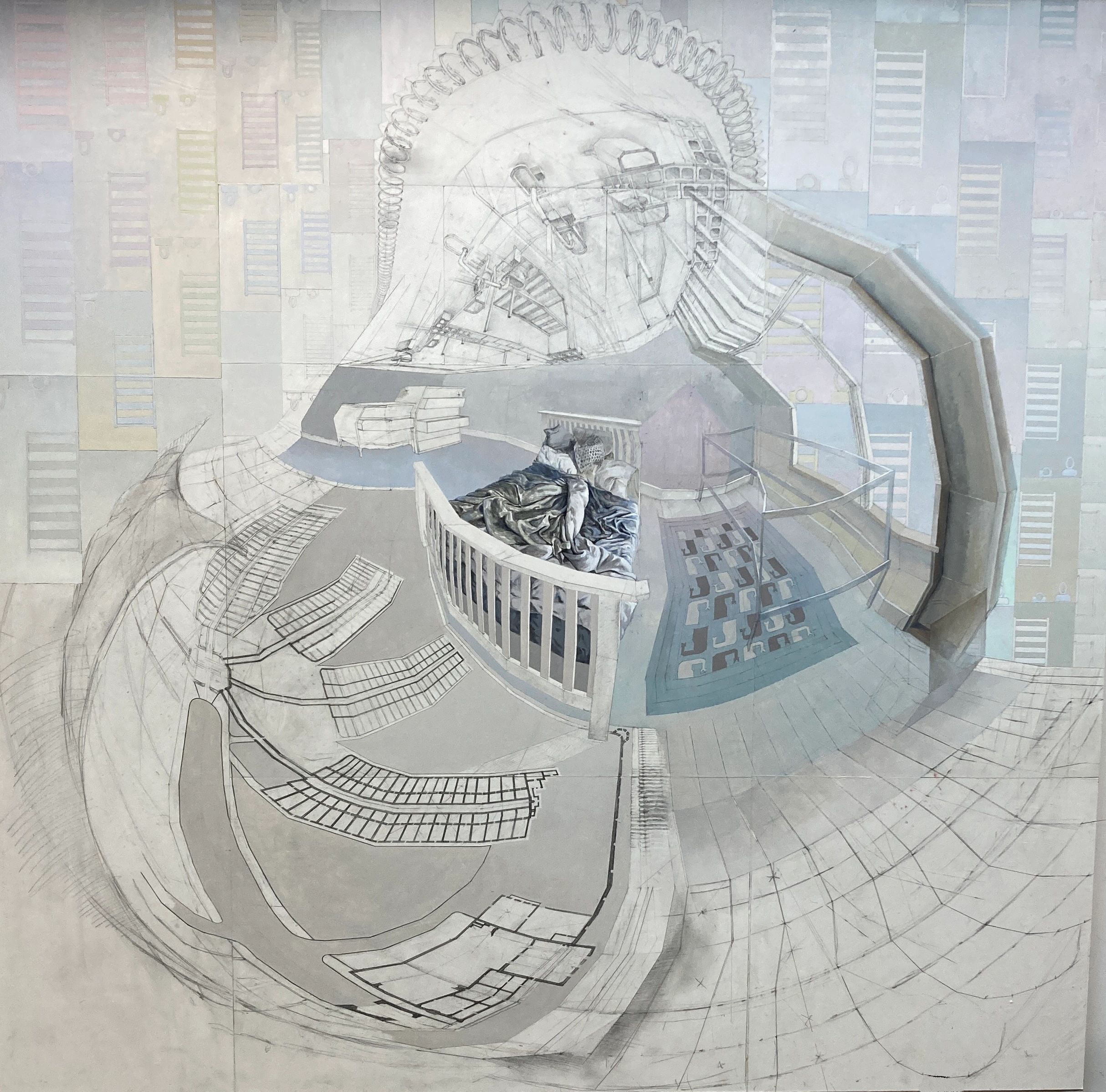 Graphite and acrylic on paper mounted on canvas, 60"x60", 2025