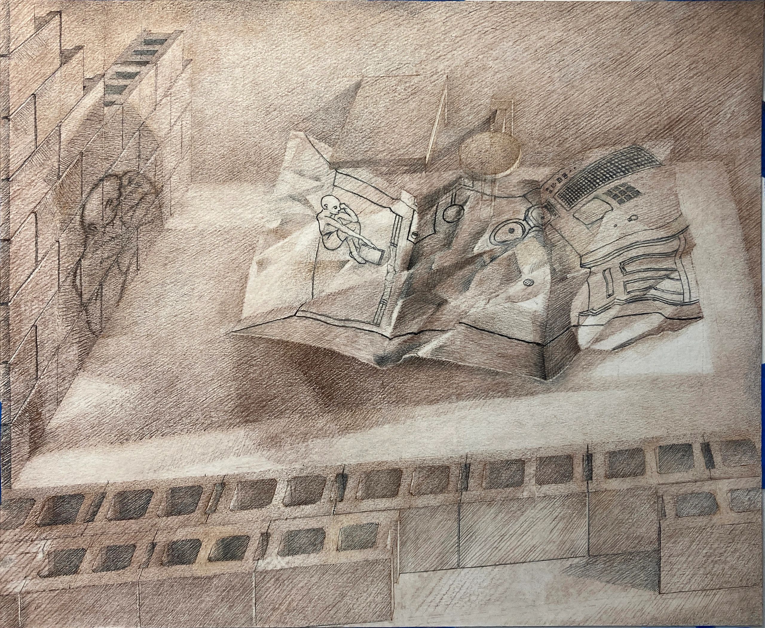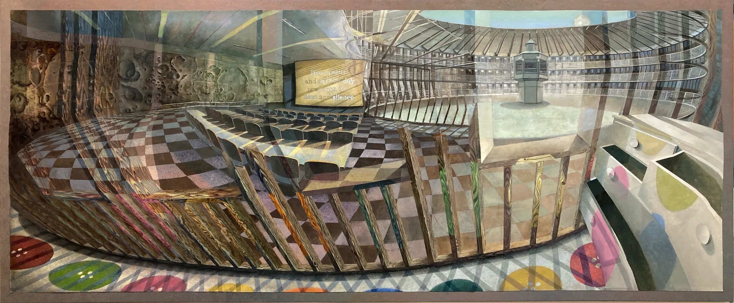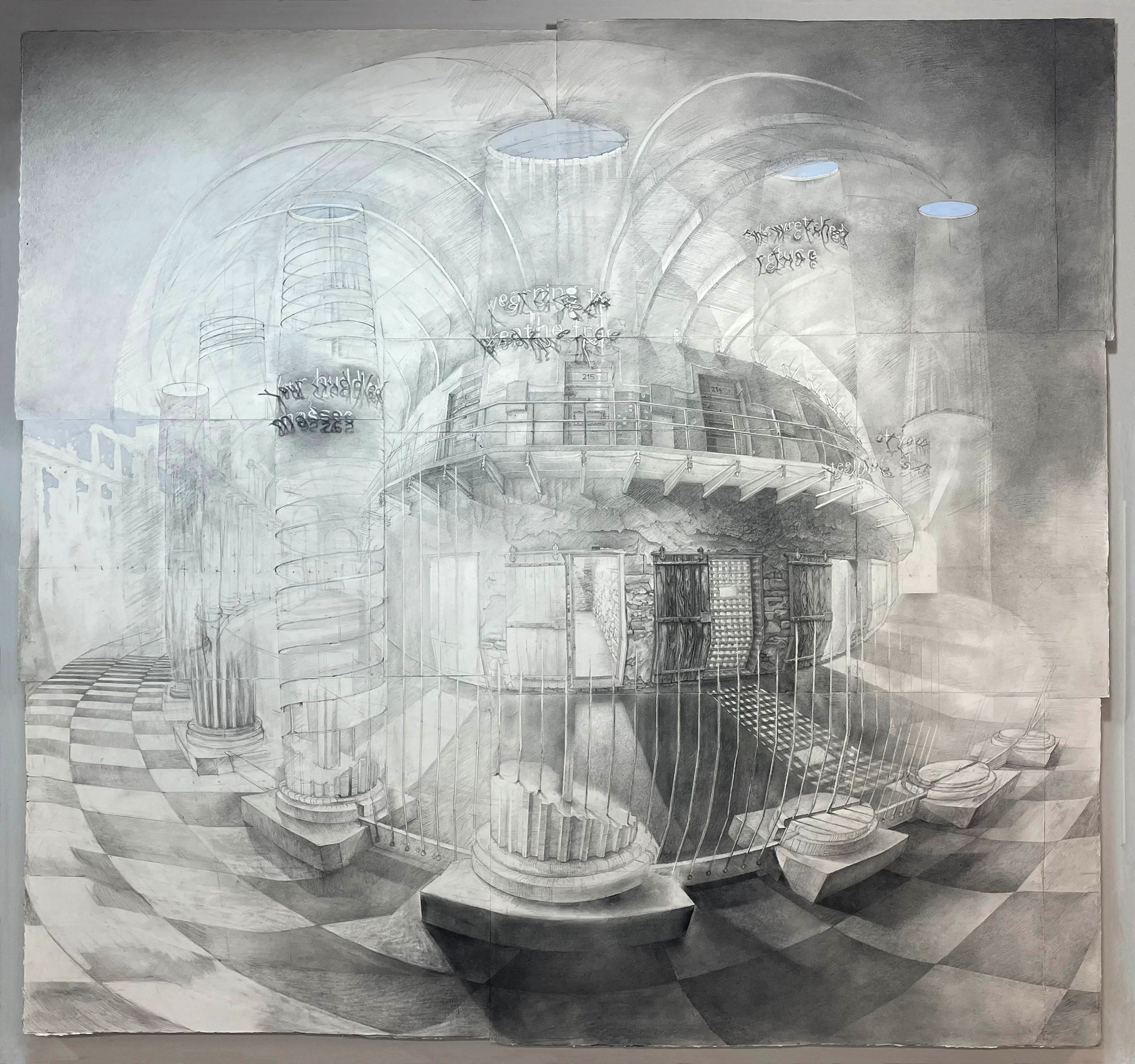 When viewing my large graphite drawing Old and New Colossus, you will encounter a building that combines examples of the origins and contemporary practice of solitary confinement in our country (Eastern State and Pelican Bay, respectively). The drawing is inspired by the 18th century artist Giovanni Piranesi, who not only made a famous series of imagined prisons entitled Il Carcieri, but also combined buildings from different regions together into fictionally unified spaces in a series called Capricci, blurring lines between reality and dreamscapes.